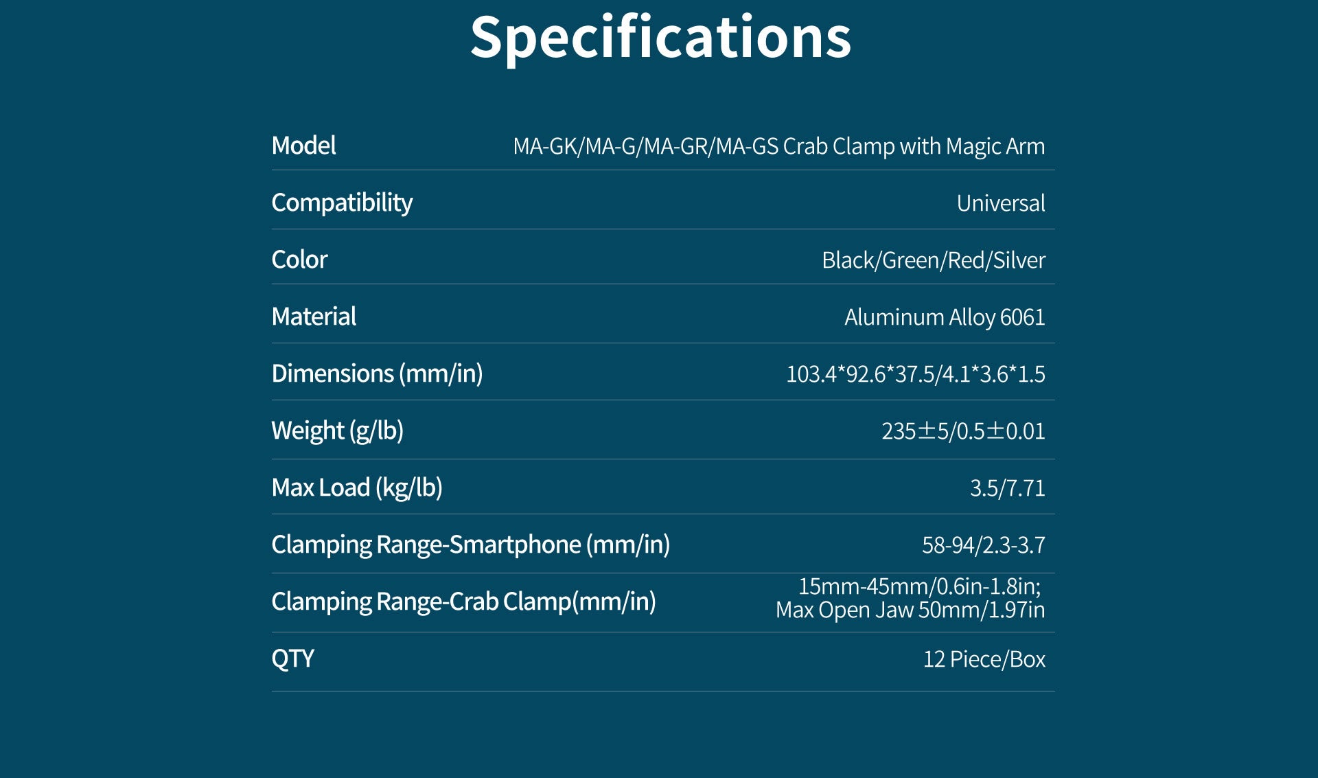 クランプ範囲は 15mm/0.6 インチから 45mm/1.8 インチで、最大オープンジョーは 50mm/1.97 インチです。クランプジョーにゴム製パッドが内蔵されているため、クランプが三脚や C スタンドを損傷することはありません。