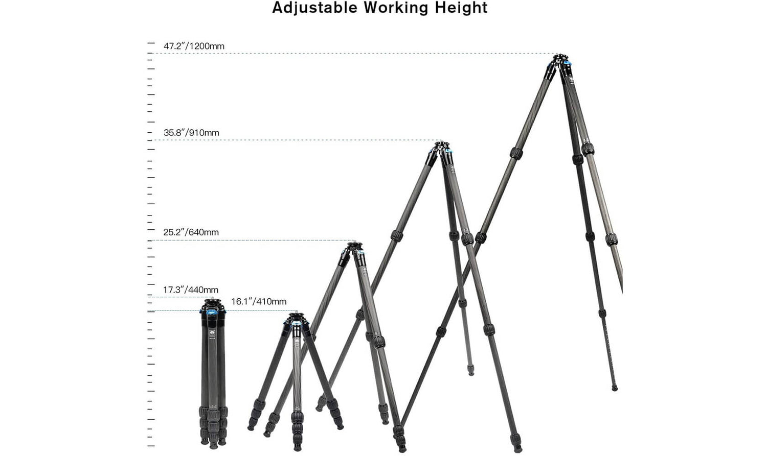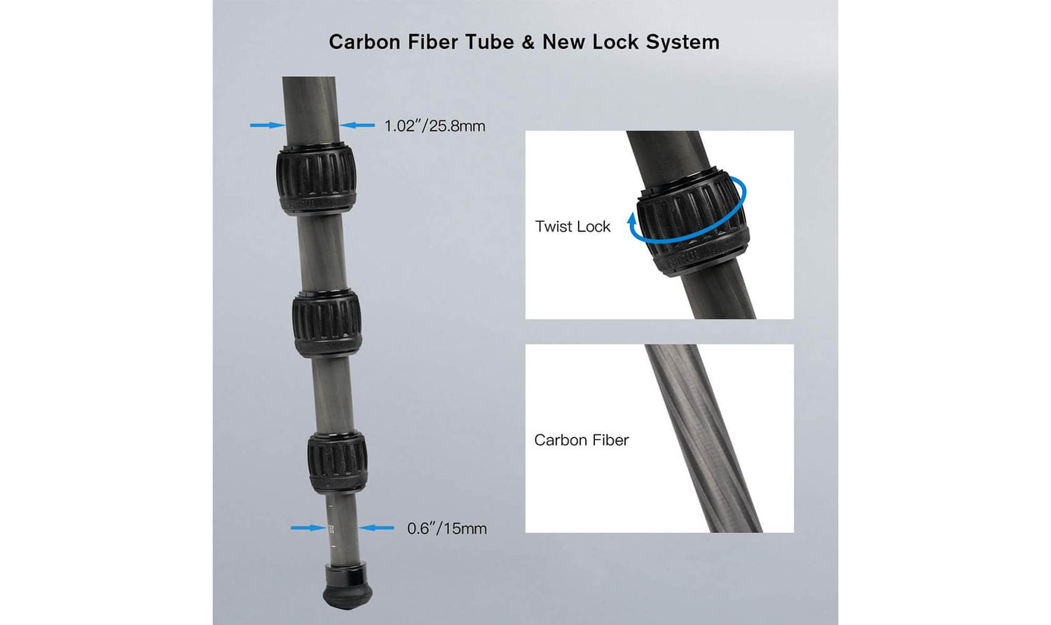 | Carbon Legs | 4 Sections | ø 15 - 25.8 mm | 3 Sections | ø 16 - 22 mm | 5 Sections | ø 10 - 22 mm | 4 Sections | ø 18.6 - 29.4 mm | 4 Sections | ø 18.6 - 29.4 mm |