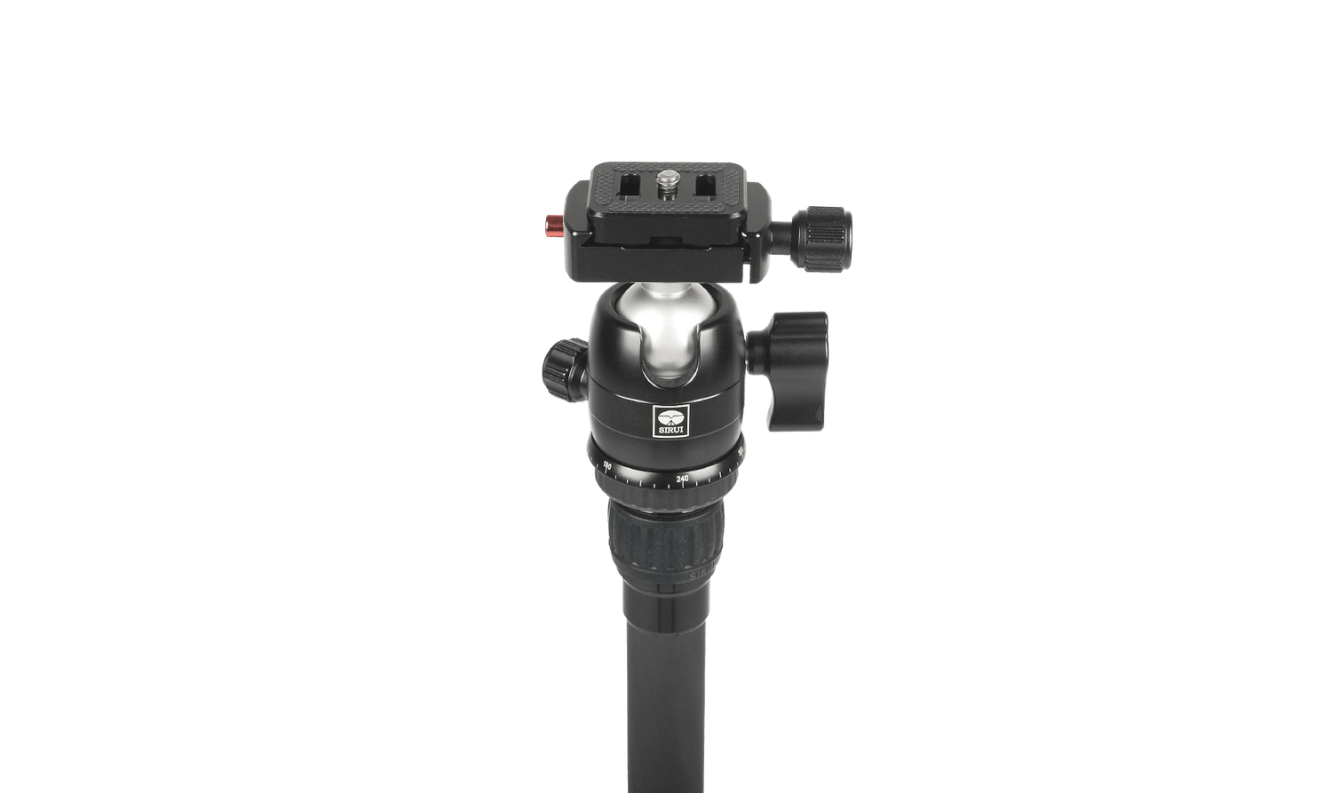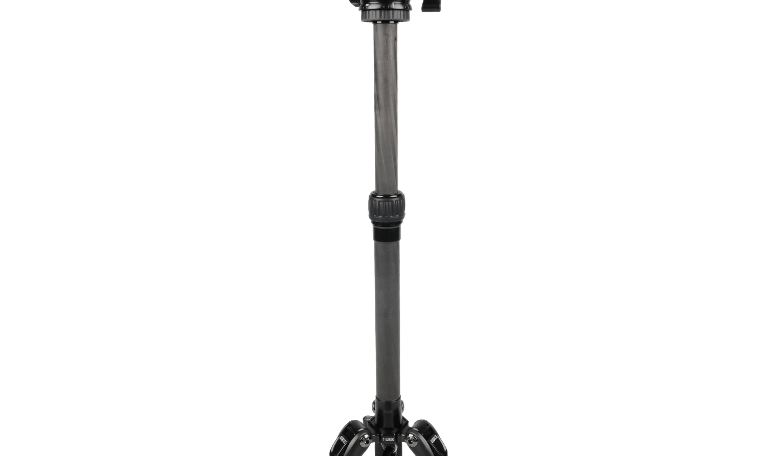 The black T-25SK T-0S Series Travel Tripod with B-00K Ball Head is a 5-section support with carbon fiber legs that extend, along with the 2-stage rapid center column, by unlocking each twist lock section. Therefore, the tripod can reach a maximum height of 53.8". With three variable leg angles, independent leg spread, and the removable center column, the legs can completely splay out to have a minimum height 3.1". To store or carry the 2.2 lb tripod, the legs fold 180° to produce a compact 12.2" support.