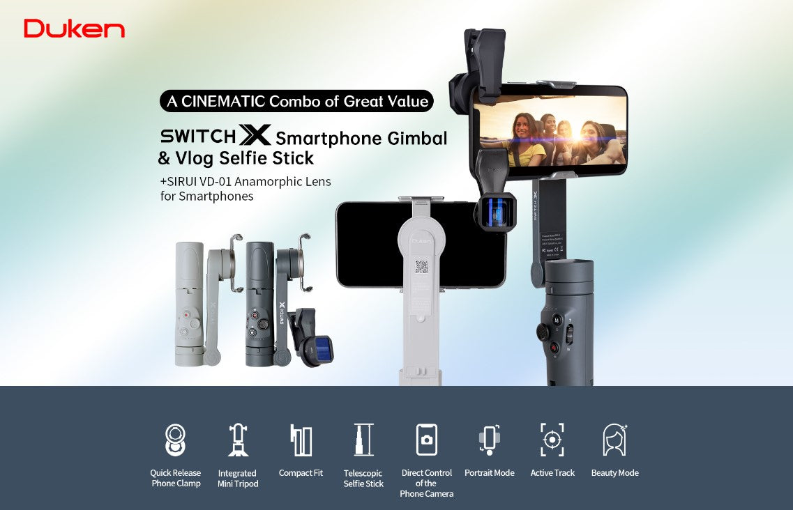 DUKEN Switch X is a foldable smart gimbal that can be used together with SIRUI smartphone Anamorphic lens. The perfect combination of the multiple shooting modes that the gimbal features with the 2.4:1 aspect ratio, lens flares, oval bokeh, etc. that the lens produces allows you to capture stunning shots with a high-quality anamorphic look at a low cost.